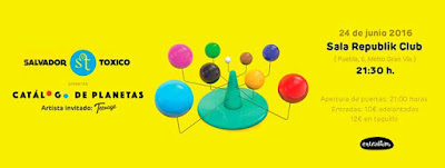Para el concierto que se celebra el 24 de junio en la Sala Republik Club (C/ Puebla, 6) de Madrid. Allí Salvador Tóxico presentará en Madrid su Catálogo de Planetas, y abriendo la noche estará Teenage tocando canciones bailables y presentando algunas de las que será su próximo segundo disco. Entradas baraticas en Entradium a 10€